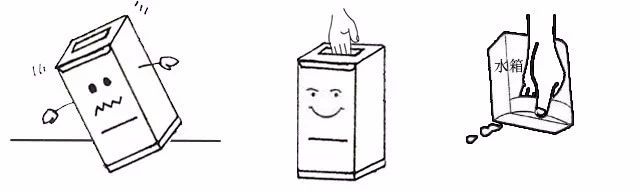 在搬動(dòng)或收藏時(shí)請(qǐng)勿將除濕機(jī)側(cè)放或倒置。移動(dòng)時(shí)直接由把手提起或用萬向輪移動(dòng)除濕機(jī)。移動(dòng)或搬用前,請(qǐng)先倒出水箱內(nèi)積水。